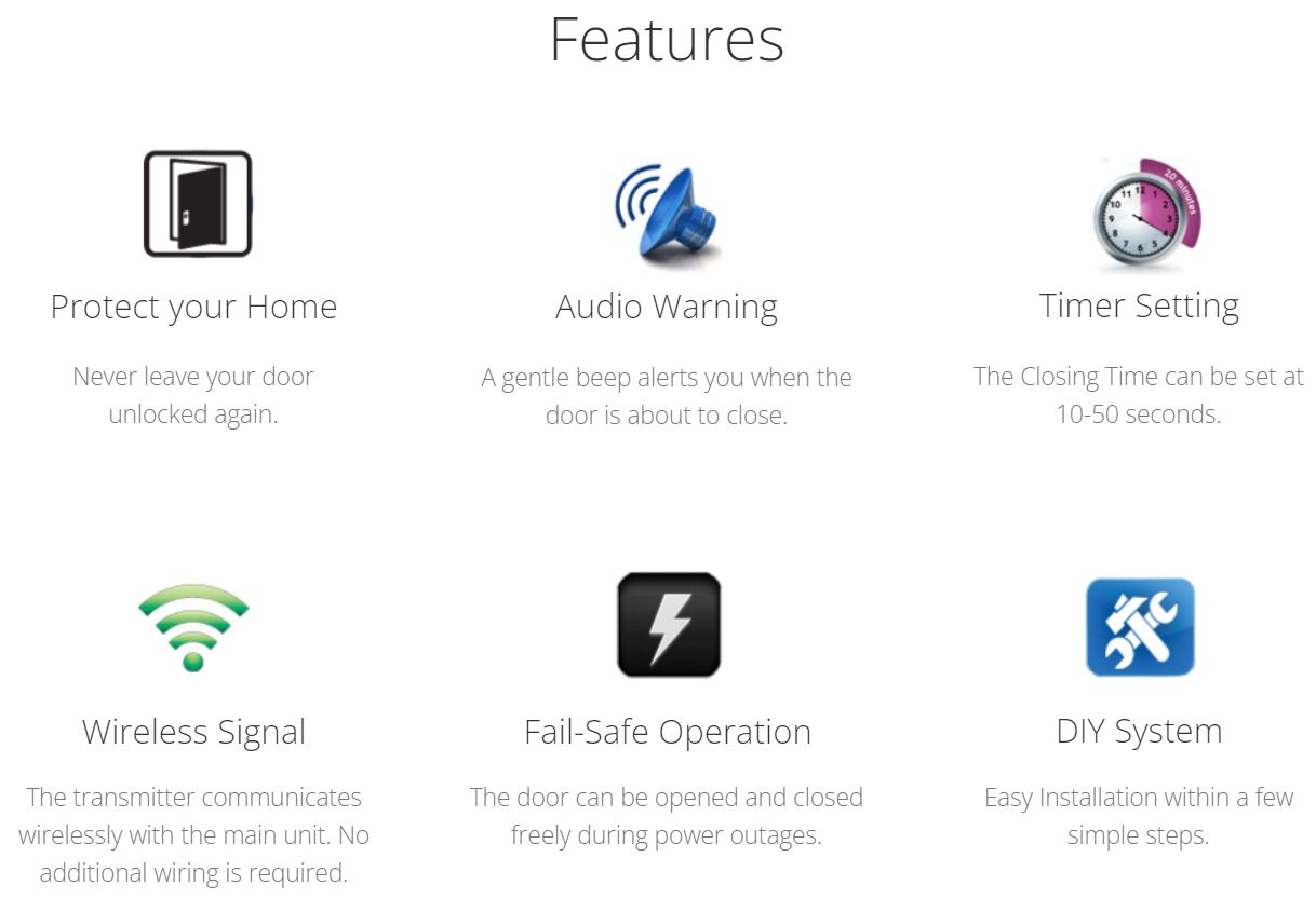 - Timer closes the door automatically after a user-programmable period of time