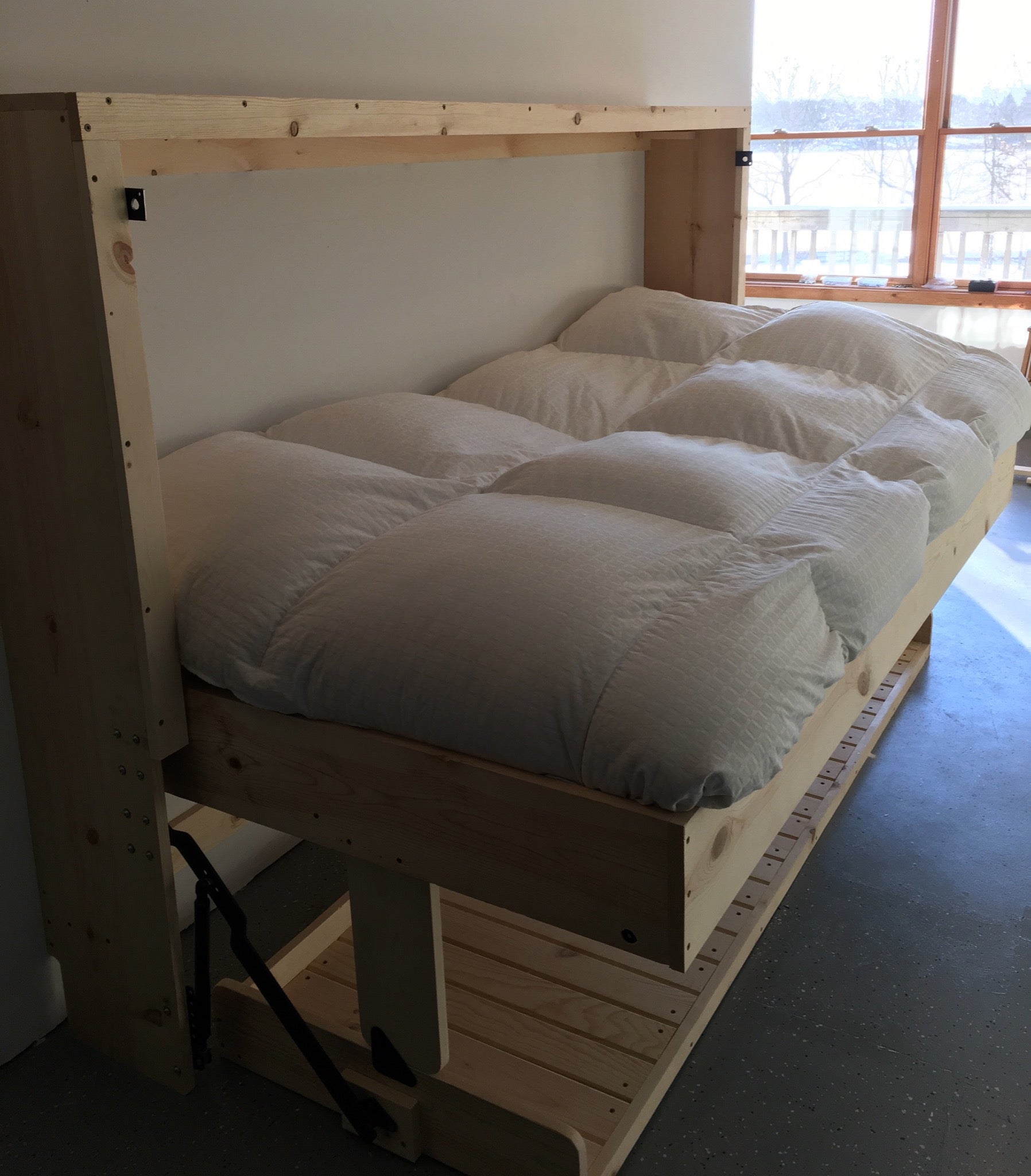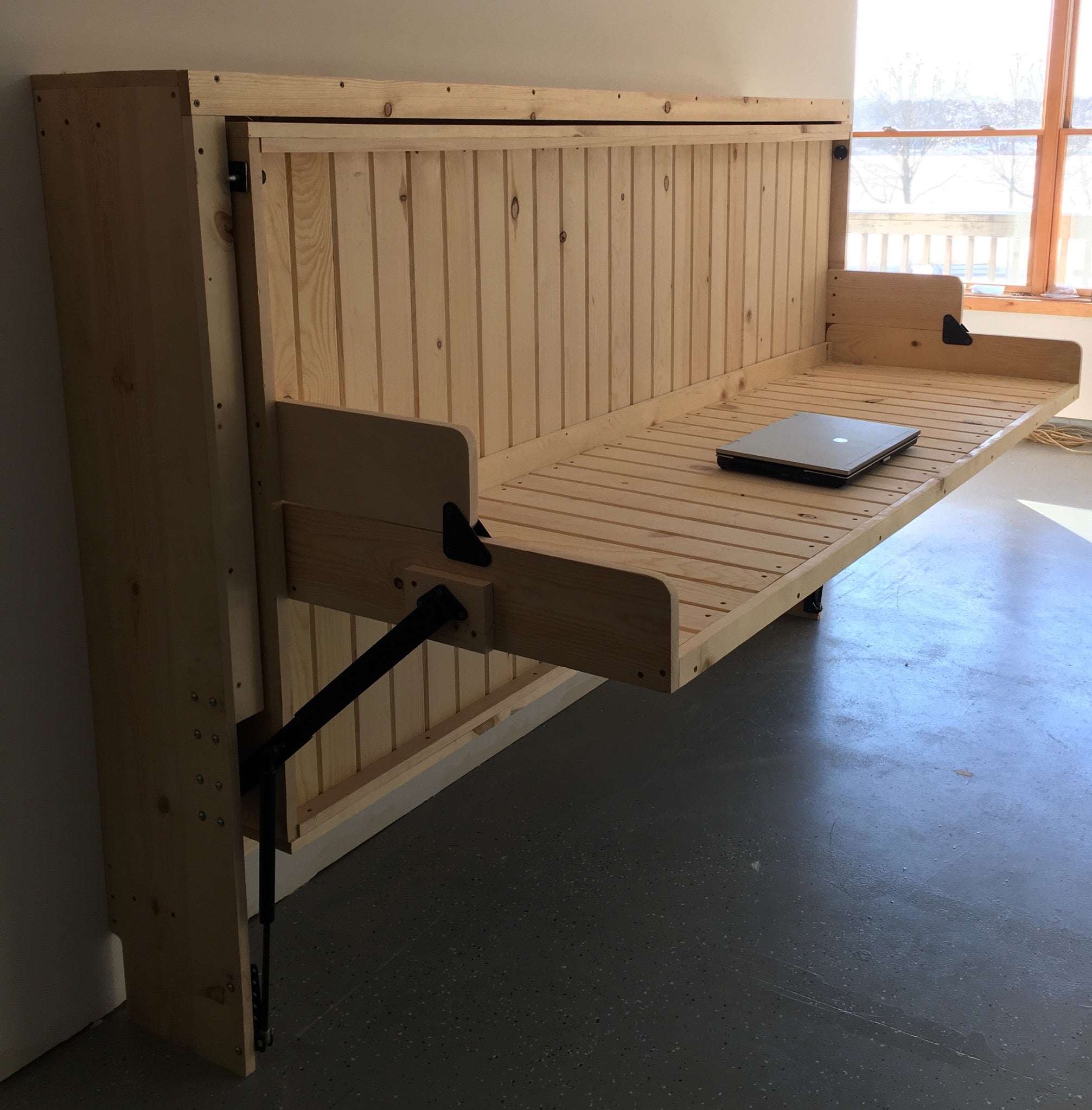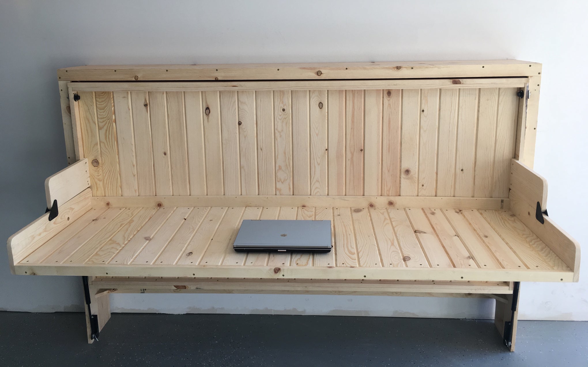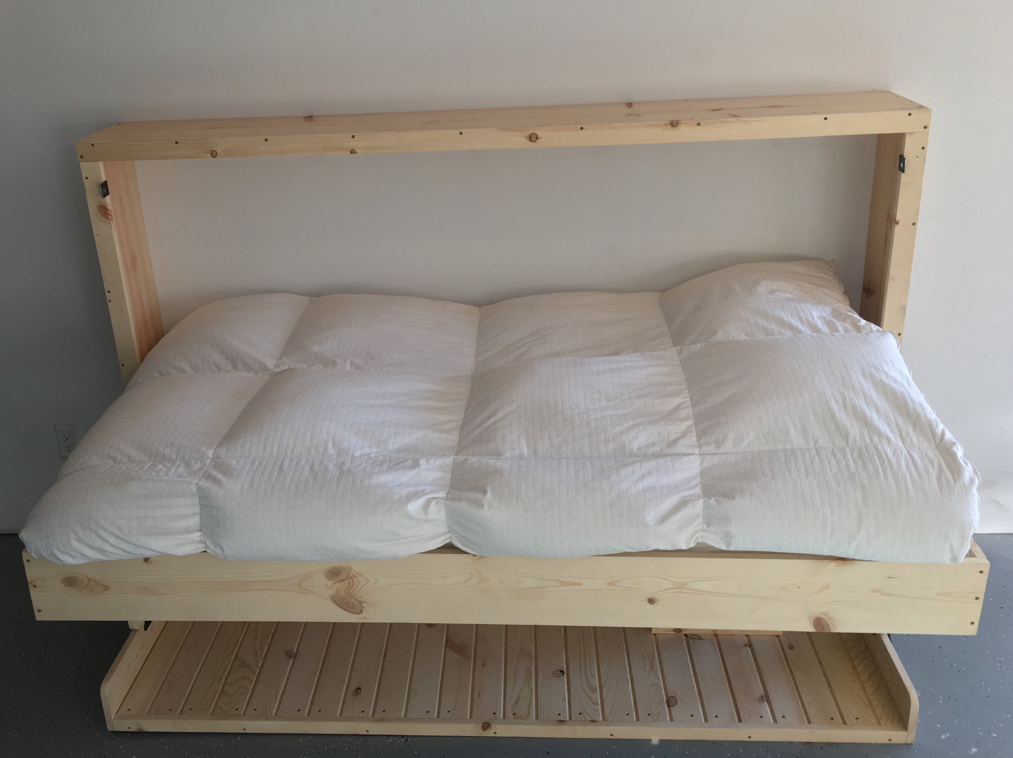 Your HiddenBed is custom made from top quality real Woods. This new economical design has a clean, minimalist design with maximum function while cutting the price in half of our traditional Hiddenbeds! Our Contemporary HiddenBed from Solid Rustic Pine is made out of real pine and comes ready to be finished at home! You can use your choice of stain, paint, or other finishes to match your decor and complete this bed however you would like! Quick and easy assembly with numbered parts, and even pre-drilled mounting holes for the mechanisms. There is no cutting, or even measuring required!
