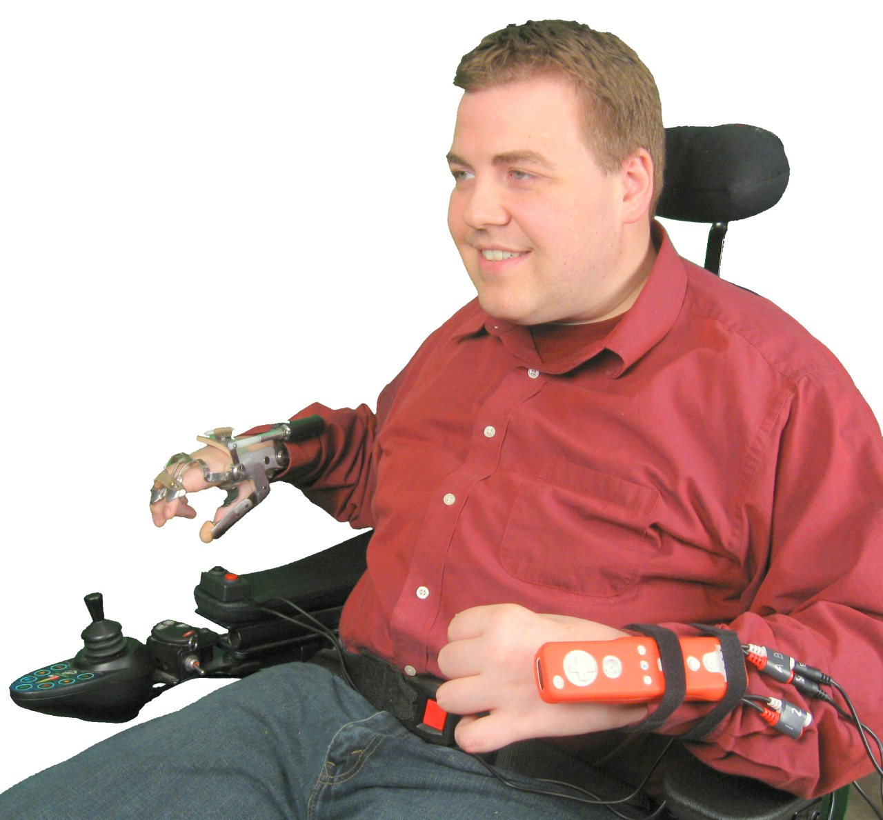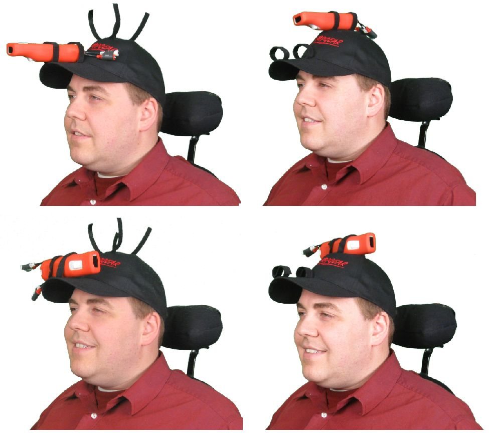 No grasp or finger dexterity required! Get into the game on the Nintendo Wii! Attaches to forearm or hat to play most games with arm or head movement. Operate A & B buttons using adaptive switches with the opposite hand or sip and puff. Professional Therapy Clinic Kits Available!