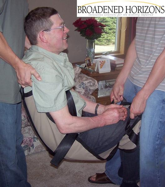 Sit Skiing: carried from wheelchair 20' down hill to the beach (early prototype). Leverage makes all the difference! Guy on right in yellow is 5'2" and 125 lbs. Helping comfortably transfer a person 5'11" and 236 pounds!