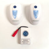 Note: Each Transmitter and Receiver are a pair. Under the cover they have a label identifying the channel they are set to. Any dot above the channel number(s) is important. It is possible to assign a second transmitter/receiver pair the same channel as a first transmitter/receiver pair so either transmitter activates both receivers. To do so, using a soldering iron add/remove solder jumpers to the 3x8 pin array so that the solder jumpers match on all the desired transmitters and receivers.