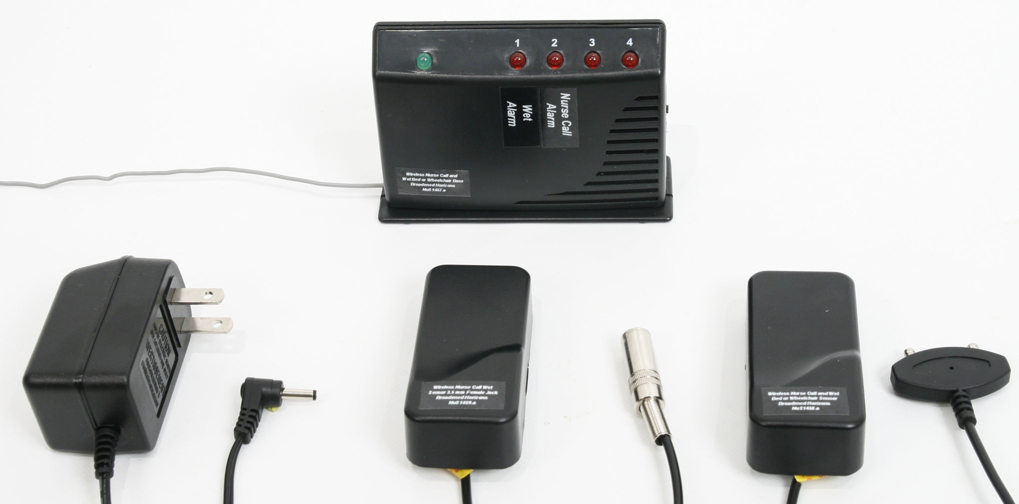 - 1 Desktop Basestation - provides a 4-location visual and audible or visual-only alarm for nurses' station or caregiver's bedroom. Supports up to 4 transmitters in up to 4 patient rooms.